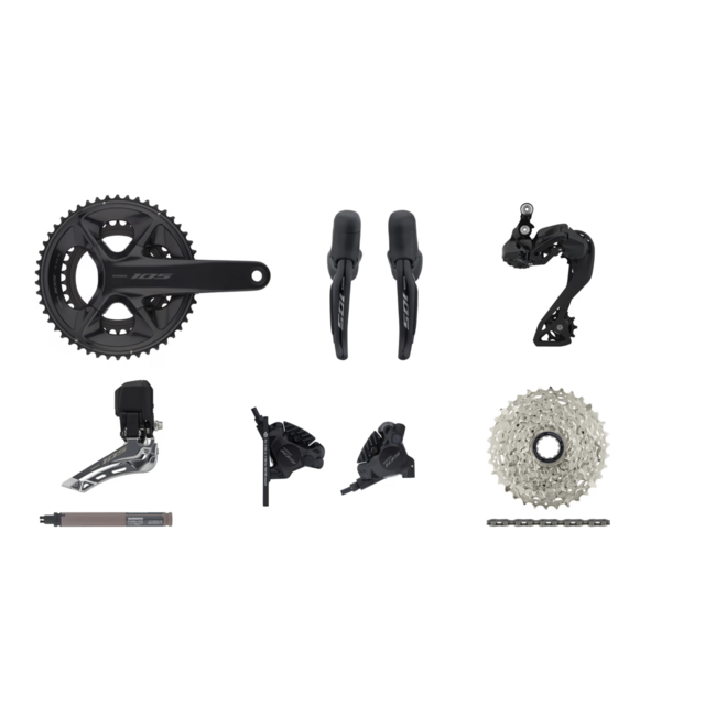 Die Gruppe umfasst eine 2x12-fach-Kurbel (34-50 Zähne), elektronisches Schaltwerk, Umwerfer, Scheibenbremsen Flat-Mount, Akku, Quick-Link-Kette und Kassette 11-34 Zähne. Damit ist sie sofort einsatzbereit und bietet maximale Performance auf der Straße.