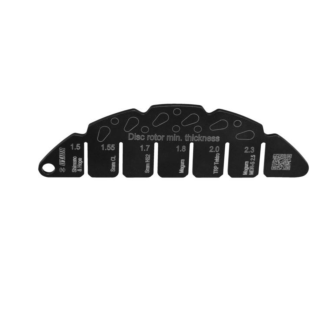 6 präzise lasergeschnittene Messnuten für Verschleißgrenzen: 1,5 mm, 1,55 mm, 1,7 mm, 1,8 mm, 2,0 mm und 2,3 mm - jede Nut ist mit der Mindestdickenangabe markiert, die von den gängigsten Bremsscheibenherstellern verwendet wird.
