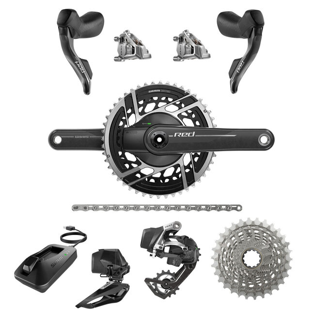 Die SRAM RED Gruppe enthält: Schaltwerk, Umwerfer, 2x Schalt- und Bremshebel, Kassette, Kette, 2x Scheibenbremssättel, 2x Akku, Akkuladegerät, Kurbelgarnitur mit Leistungsmesser (48/35 Zähne) / Hinweis: Ein Innenlager ist nicht im Lieferumfang enthalten und muss separat erworben werden.